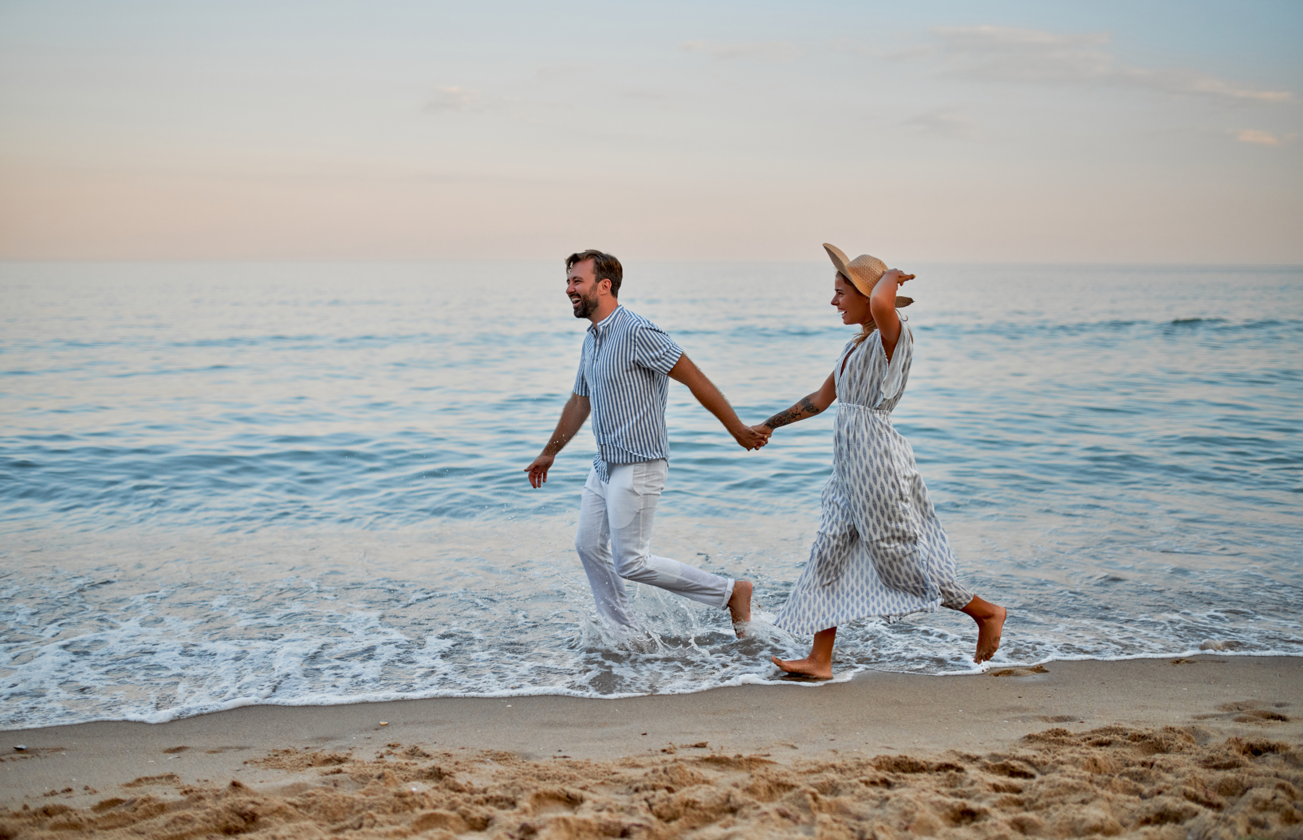 An attractive woman in a dress and a handsome bearded man in a striped shirt run holding hands and romantically spend time on the seashore. A loving couple on vacation.